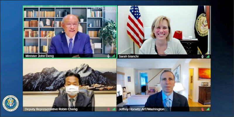行政院經貿談判總談判代表鄧振中(左上)6月初與美國副貿易代表畢昂琪(Sarah Bianchi,右上)進行視訊會談,並宣布啟動「台美21世紀貿易倡議」。兩人將代表台美召開此倡議的首場會議。(取自美國貿易代表署推特)