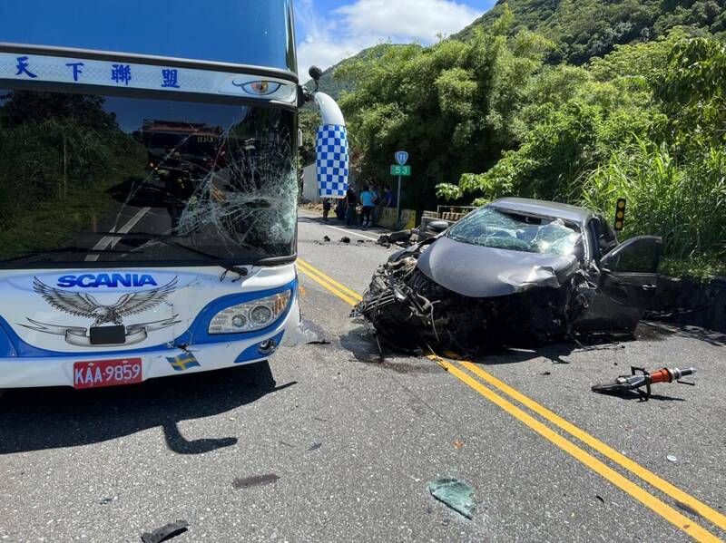 警方調查,林男被吊扣駕照,今天下午無照駕駛1輛自小客車,沿台11線南往北行駛,至53公里處時,左側超車同向行駛的遊覽車後,不慎先撞上對向由江女騎乘的普重機車後,再擦撞護欄回彈車道,並與遊覽車左前車頭發生碰撞。