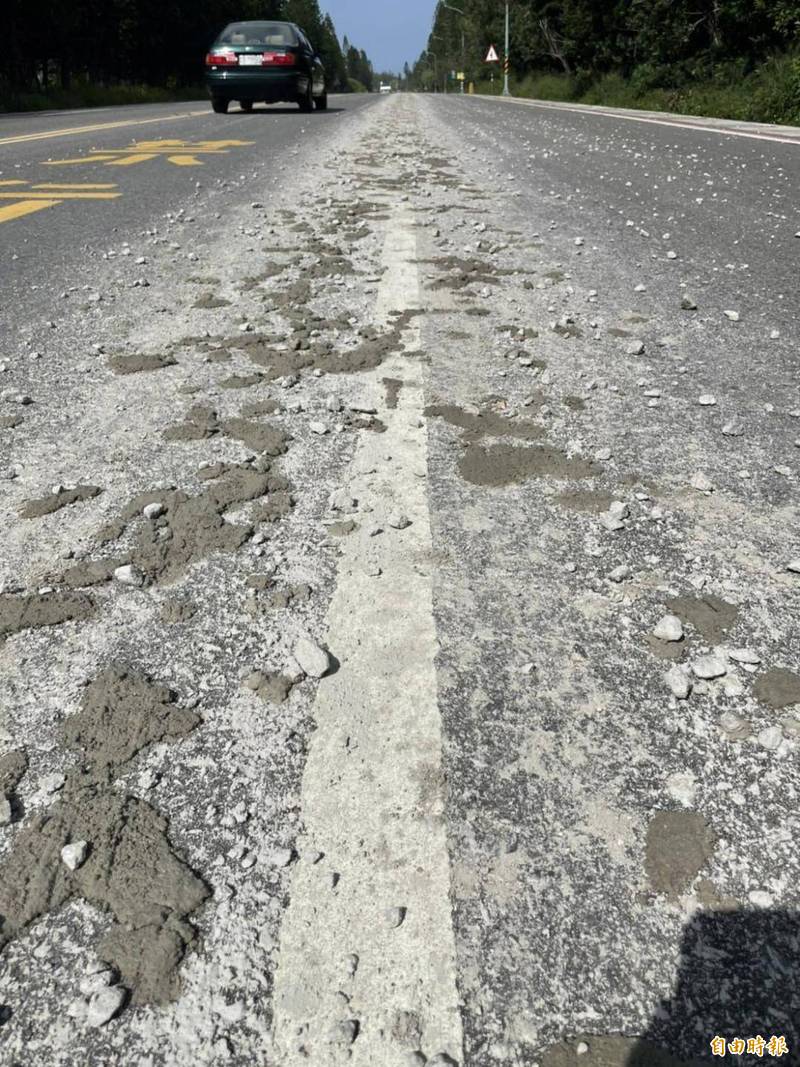今日接近中午時分,由機場往馬公的204號縣道,突然出現一條長達1公里的混凝土砂石路面,由於砂石相當尖銳,不僅汽車通過塵土飛揚,兩輪的摩托車更是膽戰心驚,擔心尖銳砂石刺穿輪胎,造成摔車或拋錨意外,警方據報後,立即調閱路口監視器,查到水泥預拌車所屬公司。