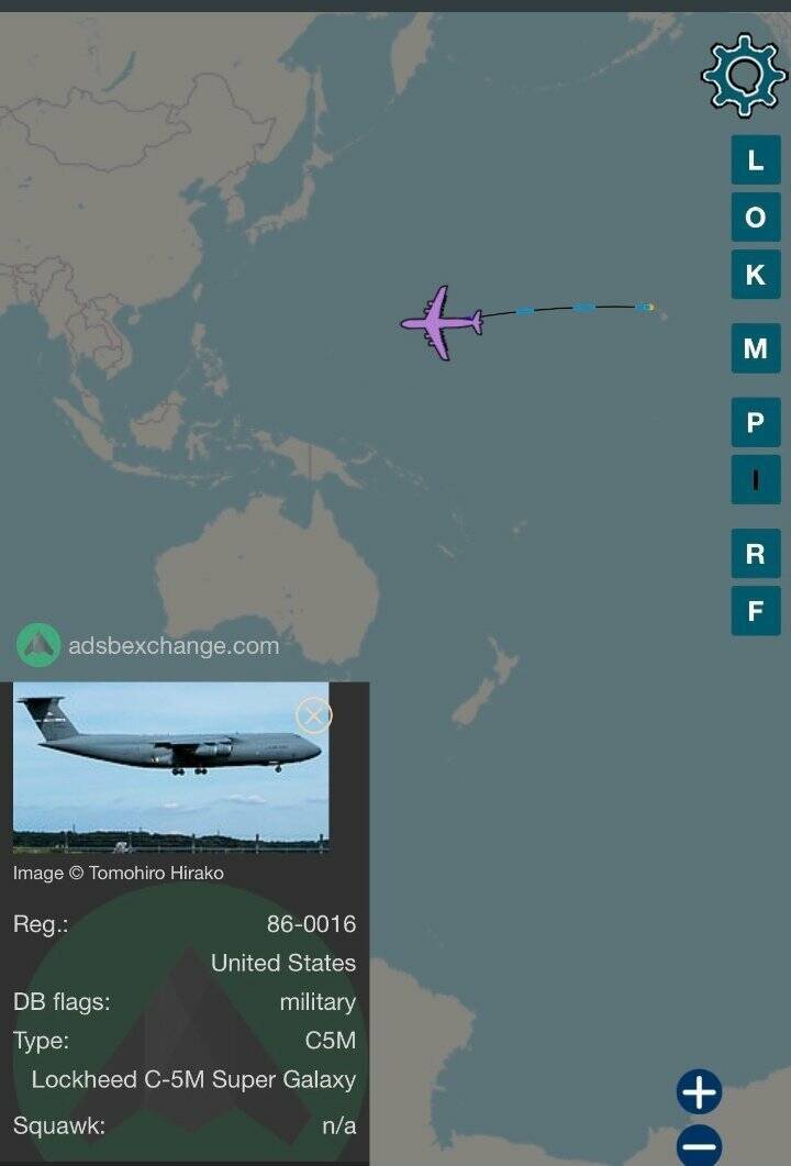 台灣時間今日上午7時,一架C-5戰略運輸機從夏威夷起飛,直線往西飛行,不久後即關閉訊號。外界推測此應是美國國會代表團專機,首站將抵新加坡。(圖擷取自推特)