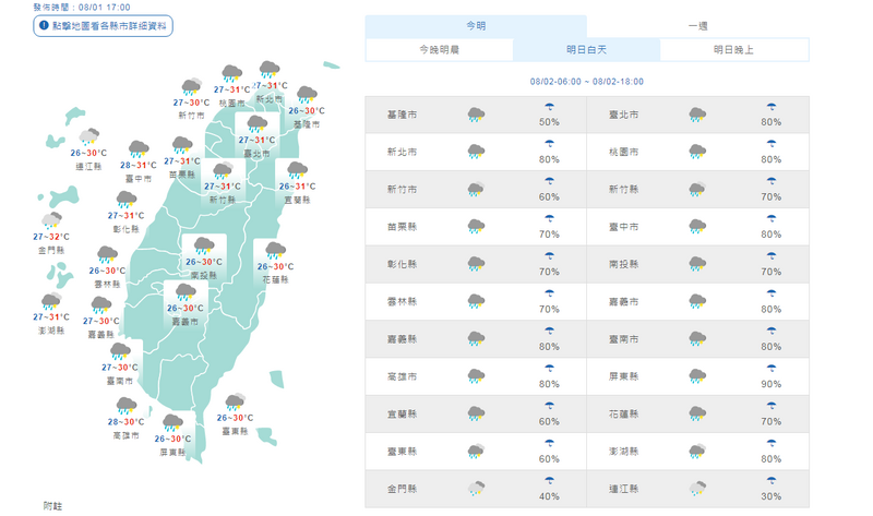 〔即時新聞/綜合報導〕明天(2日)仍受低壓帶影響,各地皆有短暫陣雨或雷雨,中南部、東南部地區及其他山區易有局部大雨,午後其他地區亦有局部大雨發生的機率,外出需注意天氣變化,建議攜帶雨具備用。