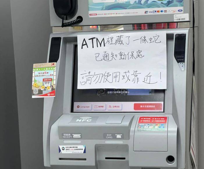 一名網友在臉書社團「爆廢公社公開版」分享照片,只見圖中是一台位於超商的ATM,但上面卻貼著一張紙條,內容是「ATM裡藏了一條蛇,已通知動保處,請勿使用或靠近!」讓身無分文急著要領錢的原PO感到有些傻眼。