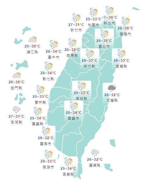 氣象局預估,週日、下週一(26日、27日)太平洋高壓北抬,不過台灣各地仍為多雲到晴的天氣,高溫炎熱,各地最高溫皆來到33度以上;降雨部分,仍因留意午後因熱力作用,各地會出現旺盛的對流發展,容易有局部較大雨勢發生。
